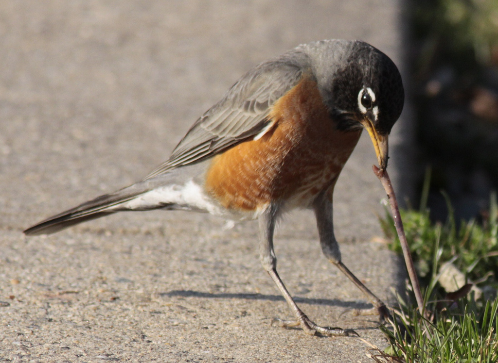 I am watching a robin trying to pull a string loose on my third story deck. He is persistent.
